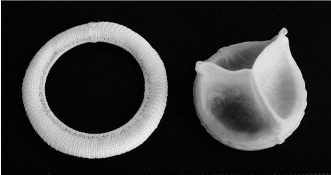 The bioprosthetic framework has a sinuous and circular shape that gives it malleability and behaves with the mechanical properties of a spring. As a result, this penetrates with its underside framework during its circular compression, then relaxes again and snaps into engagement with the sewing ring (Figure 2).