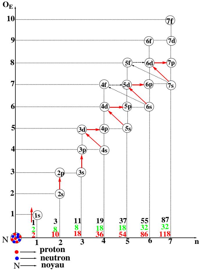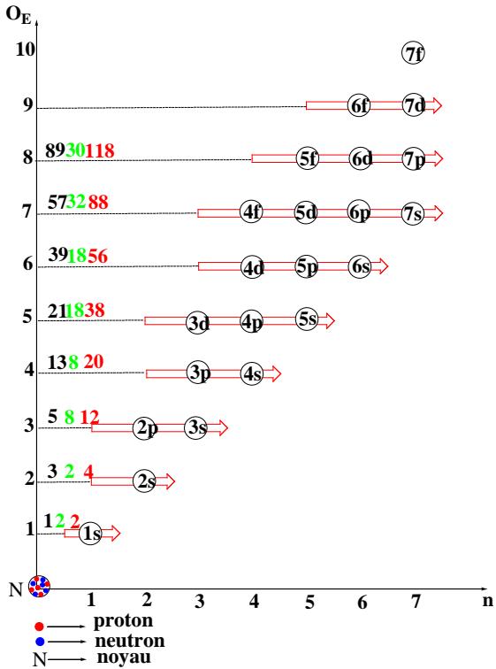 - The first line for each of the tables corresponds to the usual ordination of the natural numbers " $O_E$ " and " $n$," knowing that each number is linked to the coefficients of the different corresponding sub-shells (n, OE) are the coordinates of the sub-shells;