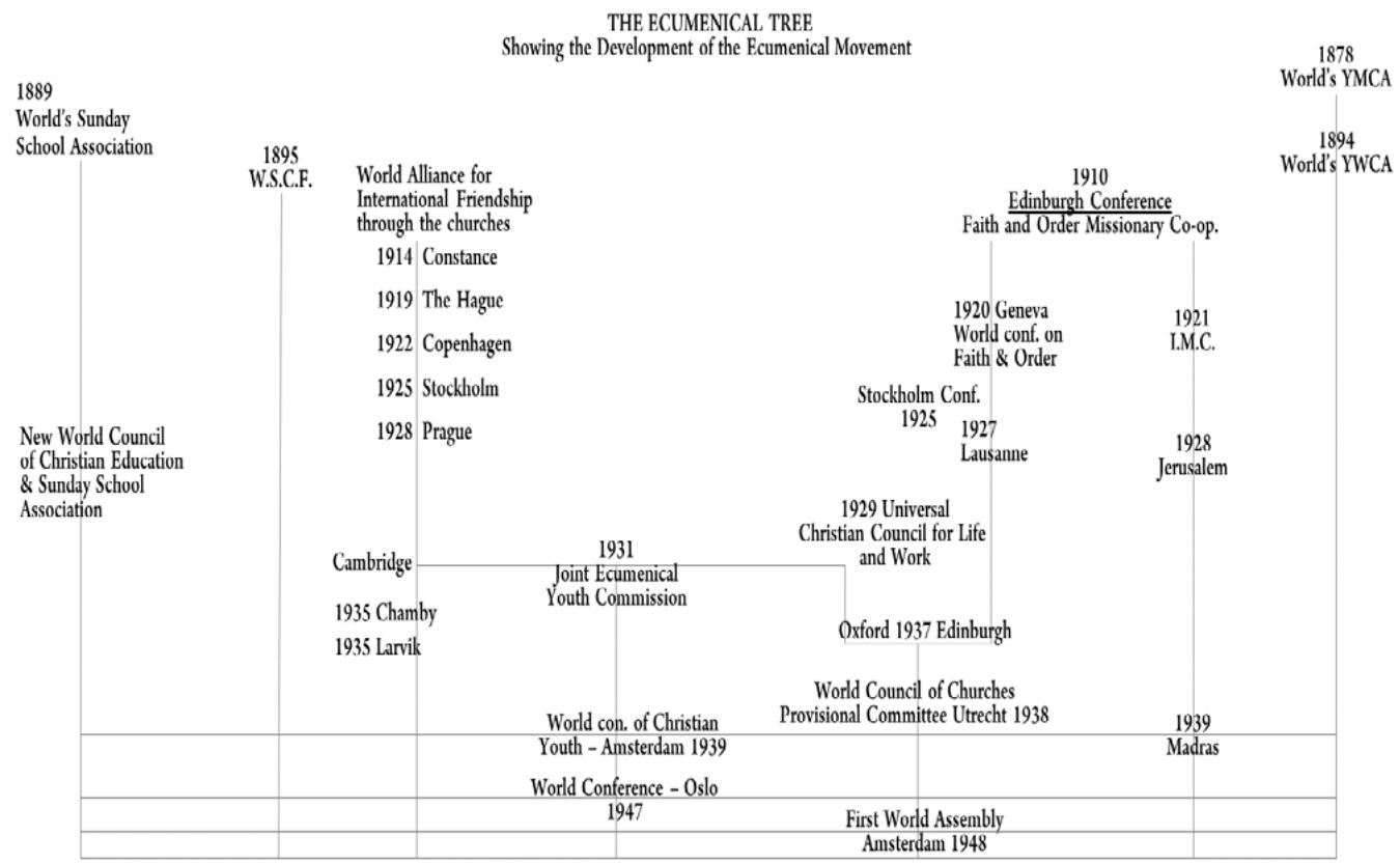 Firstly, in terms of temporal context, research pertaining to the ecumenical movement, which was widely pursued by various groups in the early 20th century, was often overlooked due to the predominant focus on themes and issues of assemblies post the establishment of the World Council of Churches in 1948.
