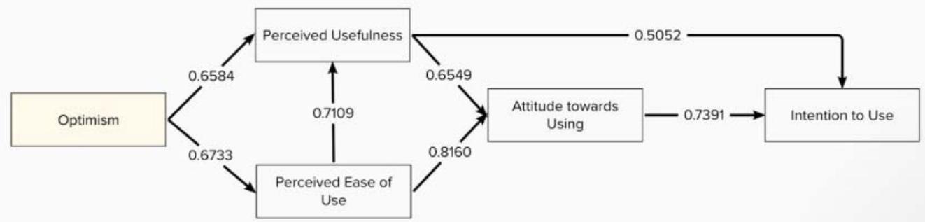 When optimism, which in the technology-readiness calculation had the highest mean value, is taken into consideration, it shows a high correlation to perceived usefulness and perceived ease of use (Figure 3). Innovativeness, the other contributing factor, has relatively lower correlation values than optimism but nevertheless contributed positively. On the other hand, insecurity and discomfort have negative and practically zero correlation values, which consistently suggests that they are also inhibiting factors in the context of this particular HEI.