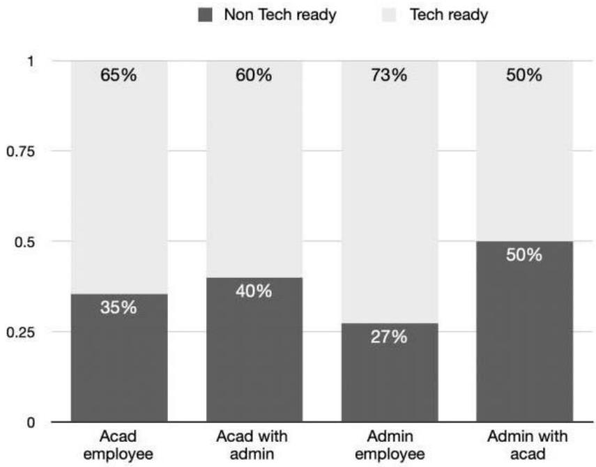 Purely administrative employees appear to have a greater proportion of technology-ready than nontechnology ready employees. This may be due to their consideration of BI tools while creating performance scorecards for their quality management system. On the other hand, the proportion for academic employees is lower, possibly because they are more focused on their teaching obligations and the current phase of the project is more focused on management metrics.