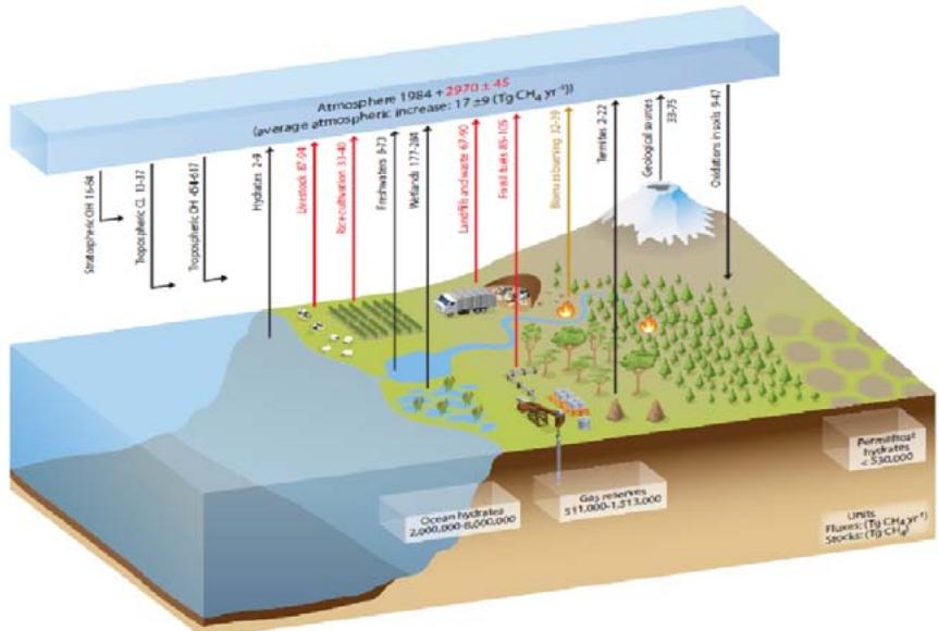 Figure 6.21 Schematic of the global cycle of CH. Numbers represent annual fluxes in Ta(CH.) $\mathbf{v}^{-1}$ estimated for the time period 2000-2009 and CH, reservoirs in Ta (CH.) the