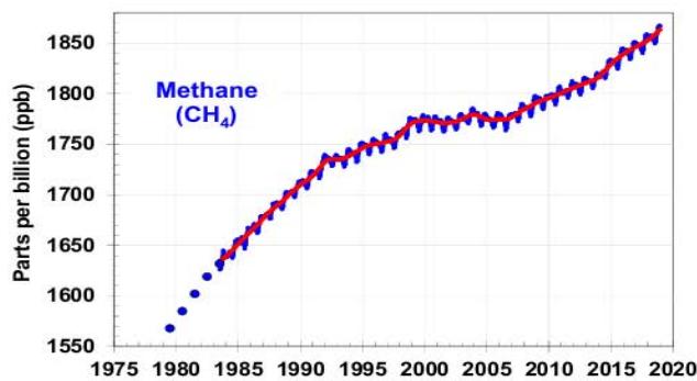 The release of methane $\mathrm{CH}_4$ into ambient air has a similar upward trend to $\mathrm{CO}_{2}$ as shown in the diagrams in Figure 3, where the almost parallel increase in the two gases is not explained by the burning of fossil fuels which is said to be due to climate change because the combustion of fossil fuels and any combustion does not emit methane $\mathrm{CH}_4$. Figure 5 below shows the emissions of methane $\mathrm{CH}_4$ into the atmosphere according to the IPCC [4] and it appears that methane $\mathrm{CH}_4$ has only emissions, there are no consumers. It is known that any decomposition of organic matter results in $\mathrm{CH}_4$ methane such as materials in landfills, livestock waste, dead biomass in forests, swamps and generally in the countryside. The largest increase in $\mathrm{CH}_4$ methane in relation to $\mathrm{CO}_{2}$ carbon dioxide ( $\sim$ 2.5 times) in the atmosphere, according to Table 2, may be due to the forest biomass abandoned by modern societies, which is not used as it used to be as an energy source.