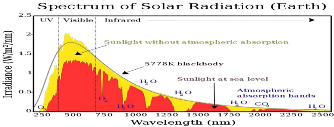 Figure 1: Spectrum of solar radiation and the behavior of the atmosphere [1]