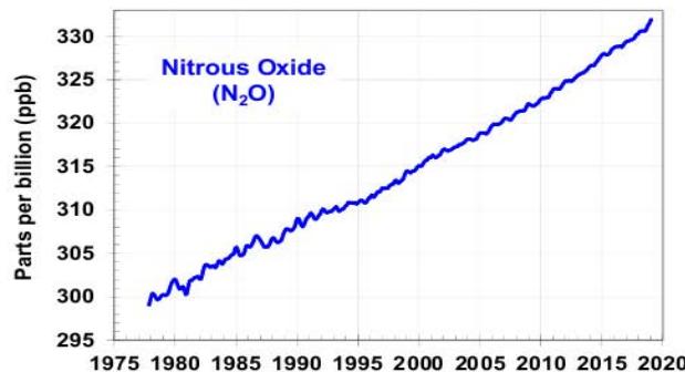 In figure 3 it is shown the recorded increase the carbon dioxide $\mathrm{CO}_{2}$, the methane $\mathrm{CH}_{4}$, the Nitrous oxide $\mathrm{N}_{2} \mathrm{O}$ and some Chlorofluorocarbons (CFC's), observed in the last 45 years.