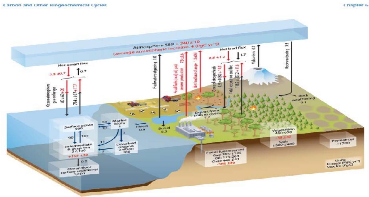 The Figure 4 then shows the flows of $\mathrm{CO}_{2}$ carbon dioxide from earth's activities and the atmosphere according to the IPCC, in which it appears that the sources of carbon dioxide emissions are not only the combustion of fossil fuels, but there are other natural sources that emit it.