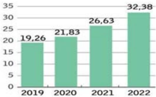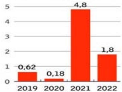 <table><tr><td></td><td>2022</td><td>2021</td><td>Var.%</td></tr><tr><td>Biomasa</td><td>1,51</td><td>1,63</td><td>-7,4</td></tr><tr><td>Eólica</td><td>8,75</td><td>7,15</td><td>22,4</td></tr><tr><td>Pasada (minihidro)</td><td>2,23</td><td>2,05</td><td>8,8</td></tr><tr><td>Solar</td><td>14,03</td><td>10,53</td><td>33,2</td></tr></table>