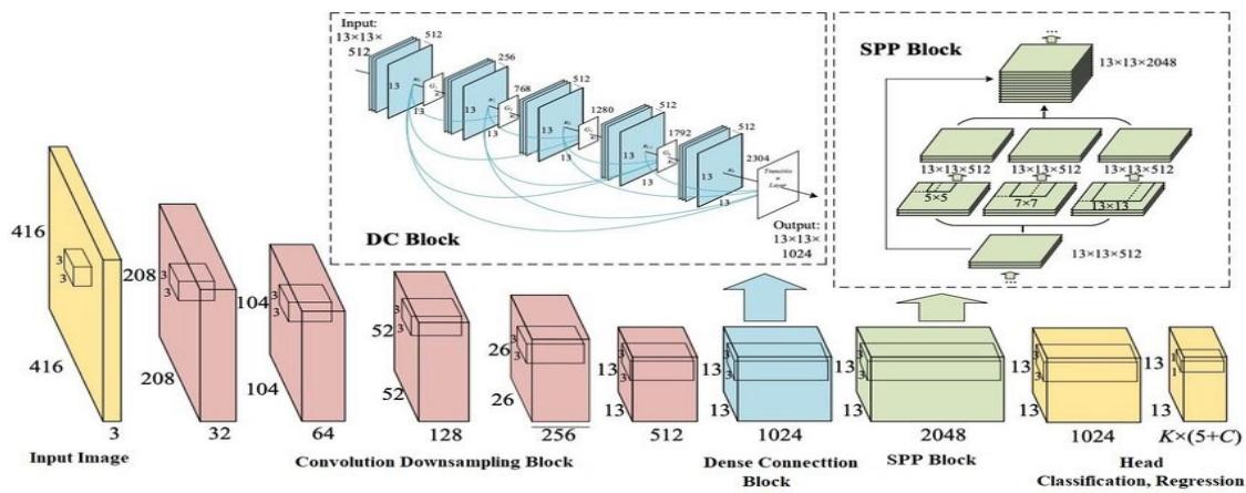 The proposed algorithm, YOLO version 4, consists of 53 convolution layers. The architecture is made up of three different layer forms. Firstly, the residual layer is formed when the activation is easily forwarded to an inner-layer neural network [9]. In a residual setup, the result of layer one is summed to the output of layer 2. The second is the detection layer which performs detection at three different scales or stages. The size of the grids is increased for detection. The third is the up-sampling layer which increases the spatial resolution. Here the image is up-sampled before it is scaled. Also, the concatenation operation is used to concatenate the outputs of the previous layer to the presentation layer. The addition operation is used to add previous layers.