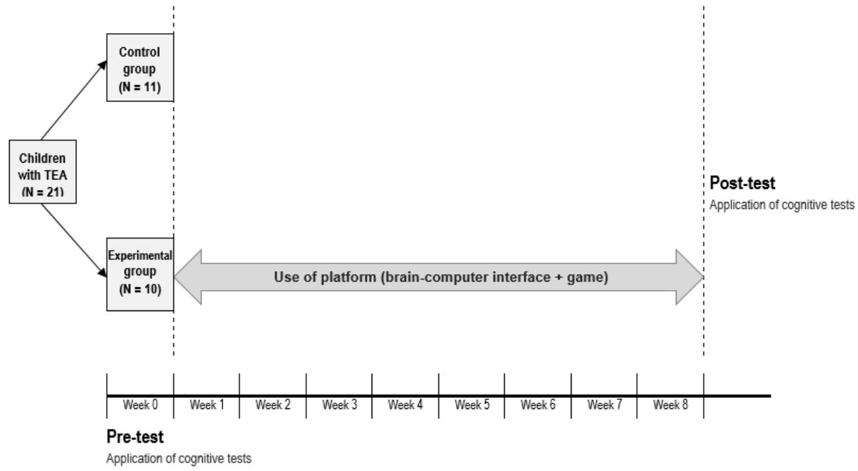 The experimental group $(n = 11)$ participated in sessions using the BCI platform twice weekly, each lasting 30 to 40 minutes. Before each session, participants received instructions on the game and the Brain-Computer Interface's functioning. The ICC was configured and calibrated for each participant at the beginning of each session. Each participant underwent an average of eight weeks of training, comprising 16 sessions each. In the end, the researcher, in collaboration with a neuropsychologist, analyzed the test data (Figure 1).