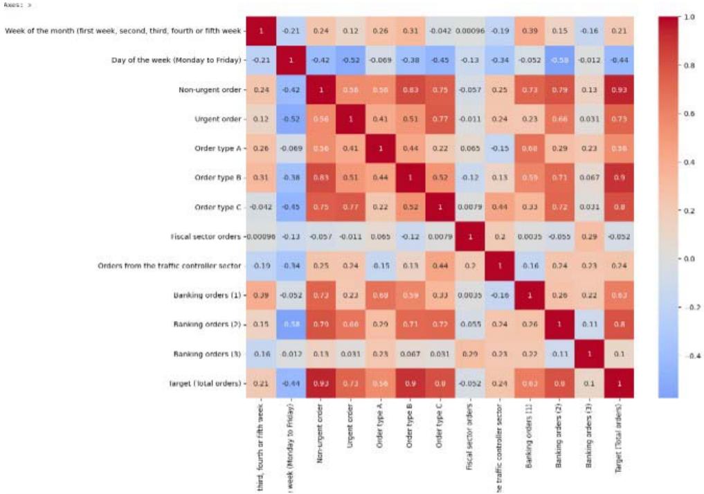 From the heatmap, we can see that non-urgent order, urgent order, order type A, order type B, order type C, and orders from the traffic controller sector have a strong positive correlation with Target (Total orders). This suggests that these variables will be good predictors for the total orders.