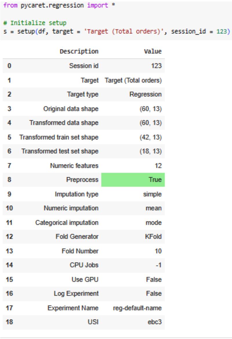 PyCaret is a very robust Python library that will be used to compare different regression models and find the best one for our dataset. Firstly, regression module is set up in PyCaret with our dataset. Then, the compare Models function is used to compare different models. This function trains all models in the model library using cross-validation and evaluates performance metrics for regression, such as MAE, MSE, RMSE, R2, RMSLE, and MAPE. Another merit from this approach is that PyCaret library takes care of all the pre-processing