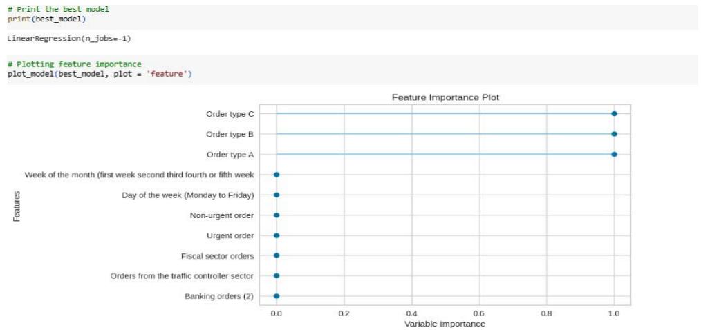 According to Chopra and Meindil 2011, supply chain is a system that consists of a manufacturer, suppliers, transporters, distributors and retailers; where they all share information and goods and services are delivered among them to meet up with the demand of consumers. Considering the set of entities involved, supply chain is considered as a major aspect in the business circle. It is a whole cycle of procedures and end-to-end flow of materials, information and funds starting from the product design stage to fulfilment. As noted by Casson 2013, economics factors are the key factor in supply chain as it shows greater impact on size and shape. Beyond economic factors, Ketchen and Giunipero 2004 highlighted the effect of strategic choices on supply chain set up, coordination and operation. To deliver best and optimal solution, supply chain activities must be strategically laid out, coordinated and handled. Proper coordination will emanate from balancing the demand and supply ends. Various variables such as weather, market trends, and season, consumer behaviour exist between the two ends and thus coordinate planning must be fashioned out. The volatility in these variables prompt for demand forecasting. As mentioned by Hope and Fraser 2003, demand forecasting is one of the prerequisites for strategical planning in supply chain management. Many techniques and methods have been used to investigate contributing variables and forecasting of orders based on historical data. In this study machine learning regressors will be used to make order predictions using dataset acquired on the field for 60 days in a Brazilian logistics company. Machine learning is a sophisticated methods posit by advancement in computing technology where historical data are trained to build models which are subsequently used to make predictions. It exists as classification or regression means. For regression, predictions are made for continuous variables like demand in supply chain. According to Al-Jarrah et al 2015, machine learning is perfectly efficient in the analysis of voluminous data that exist in demand forecasting study. To effect more accurate demand prediction, robust regressors models will be developed using Python Library PyCaretwhile key contributing features are validated through feature importance plot. The various machine learning models (Ridge, LASSO, XGBoost, Bayesian Ridge, Linear Regression, Gradient Boosting, KNN, Random Forest and others) will run concurrently and their prediction performance measured with Mean Absolute Error (MAE): the mean absolute differences between predicted values and actual demand values. The lesser the MAE, the better the model predictions.