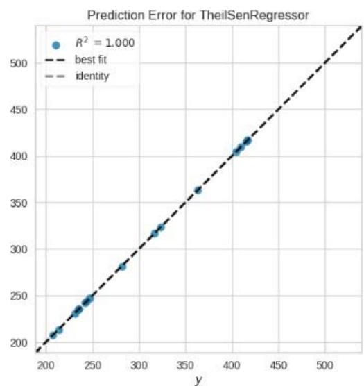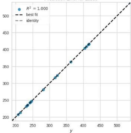 The Bayesian Ridge model achieves perfect performance, similar to the Linear Regressionmodel. The MAE, MSE, RMSE, R2, RMSLE, and MAPE values are all zero, indicating perfect predictions. The training time is 0.0440 seconds.