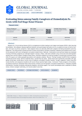Md. Rabby, Chinna Chadayan, D.Melba Sahaya Sweety. 2026. \u201cEvaluating Stress among Family Caregivers of Hemodialysis Patients with End-Stage Renal Diseasef\u201d. Global Journal of Medical Research, Global Journal of Medical Research - F: Diseases GJMR-F Volume 26 (GJMR Volume 26 Issue F1): .