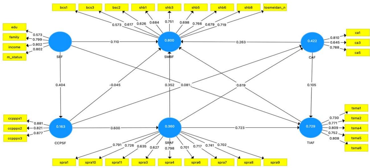 <table><tr><td>Hypothesis</td><td>Path Relationship</td><td>Path Coefficient β</td><td>t-value</td><td>p-value</td><td>F-squared</td><td>Hypothesis results</td></tr><tr><td>H1</td><td>SEF -> SMBF</td><td>0.1097</td><td>2.723</td><td>0.0065</td><td>1.272</td><td>Supported</td></tr><tr><td>H1.b</td><td>SEF -> TIAF</td><td>0.081</td><td>1.742</td><td>0.0816</td><td>0.77</td><td>Rejected</td></tr><tr><td>H2</td><td>TIAF -> SMBF</td><td>0.3103</td><td>5.682</td><td>0.000</td><td>2.605</td><td>Supported</td></tr><tr><td>H3</td><td>SRAF -> SMBF</td><td>0.3522</td><td>7.630</td><td>0.000</td><td>2.796</td><td>Supported</td></tr><tr><td>H3.b</td><td>SRAF -> TIAF</td><td>0.352</td><td>5.952</td><td>0.000</td><td>6.592</td><td>Supported</td></tr><tr><td>H4</td><td>CAF -> SMBF</td><td>0.263</td><td>7.394</td><td>0.00</td><td>3.267</td><td>Supported</td></tr><tr><td>H4.b</td><td>CAF -> TIAF</td><td>0.105</td><td>2.230</td><td>0.00</td><td>1.118</td><td>Supported</td></tr><tr><td>H5</td><td>CCPSF -> SMBF</td><td>-0.045</td><td>1.449</td><td>0.000</td><td>0.144</td><td>Rejected</td></tr><tr><td>H5.b</td><td>CCPSF-> CAF</td><td>0.048</td><td>2.215</td><td>0.349</td><td>0.350</td><td>Rejected</td></tr></table>