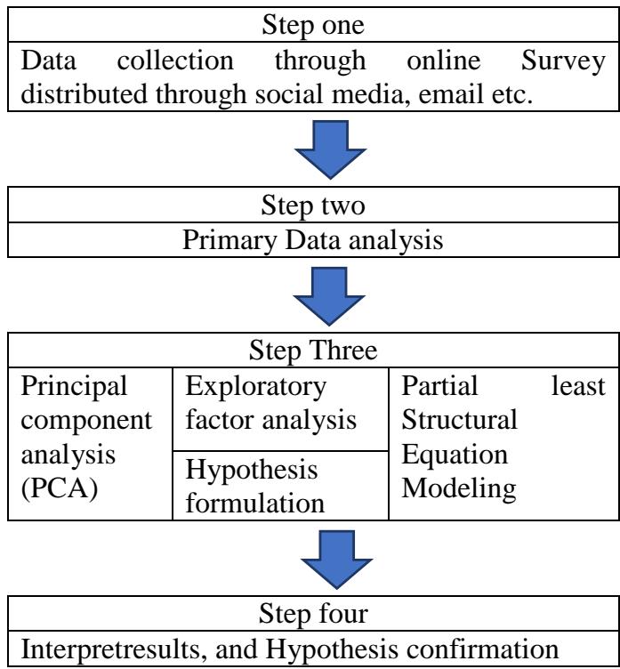 This study utilized both partial least square and structural equation modeling techniques to analyze the factors that affect online shopping behavior through social media. The research process is depicted in Figure 2, which was designed to address the issues raised in this study. The study also employed several data scaling techniques to maximize the variable loading.