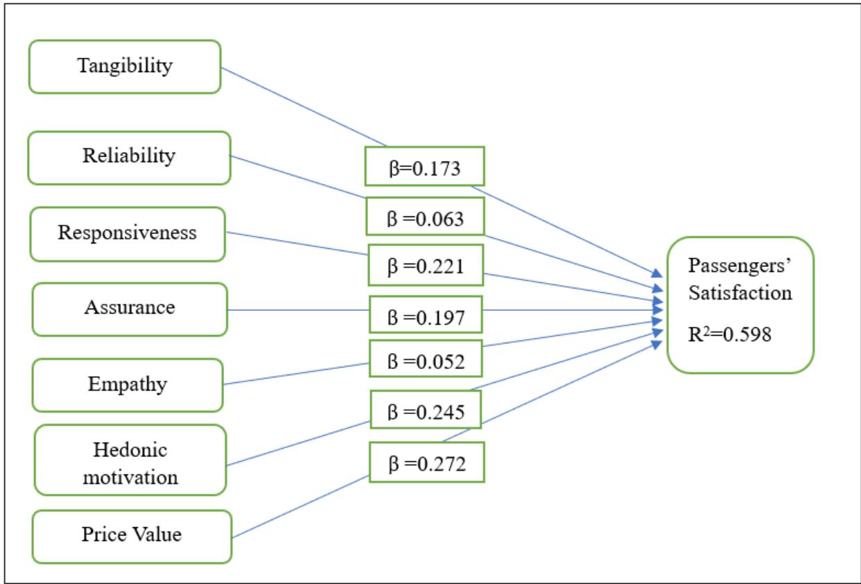 To test the hypotheses in this study, the researchers have conducted path analysis. Along with that, Reddy et al. (2023) mentioned that the cause-and-effect relationships are figured out by the path coefficients. Additionally, to analyze the structural model, the path coefficients $(\beta)$ and the coefficients of the determination $(R^2)$ are taken into consideration (Akbari et al., 2021). The value of $R^2$ (0.598) indicates that the passengers of MRT are getting $59.8\%$ satisfaction from their MRT journeys considering seven dimensions. A moderate association has been found, and the findings are supported by the value of $R^2$. The path coefficients are tested using the effective 1000 bootstrapping resampling method (Chin, 2009). From the findings, we found five hypotheses are supported out of seven. Empathy and reliability do not have significantly positive impacts on passengers' satisfaction $\beta = 0.052$, $t = 0.556$, $p > 0.05$ and $\beta = 0.063$, $t = 0.060$, $p > 0.05$ respectively). But the other constructs have significantly positive impacts on passengers' satisfaction (Tangibility has $\beta = 0.173$, $t = 1.967$, $p < 0.05$; Responsiveness has $\beta = 0.221$, $t = 2.124$, $p < 0.05$; Assurance has $\beta = 0.197$, $t = 2.506$, $p < 0.05$; Hedonic Motivation has $\beta = 0.245$,