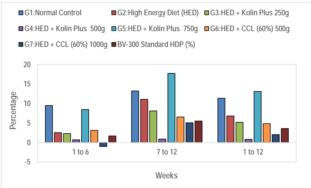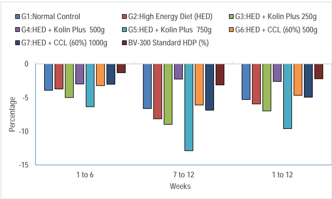 <table><tr><td>Group</td><td>Baseline</td><td>Average (1-6)</td><td>Diff</td><td>Average (7-12)</td><td>Diff</td><td>Average (1-12)</td><td>Diff</td></tr><tr><td>G1: Normal Control</td><td>94.67</td><td>90.74</td><td>-3.93</td><td>88.03</td><td>-6.64</td><td>89.38</td><td>-5.29</td></tr><tr><td>G2: High Energy Diet (HED)</td><td>93.83</td><td>90.10</td><td>-3.73</td><td>85.67</td><td>-8.16</td><td>87.88</td><td>-5.95</td></tr><tr><td>G3:HED + POH 250g</td><td>94.75</td><td>89.76</td><td>-4.99</td><td>85.76</td><td>-8.99</td><td>87.76</td><td>-6.99</td></tr><tr><td>G4:HED + POH 500g</td><td>93.50</td><td>90.52</td><td>-2.98</td><td>91.24</td><td>-2.26</td><td>90.88</td><td>-2.62</td></tr><tr><td>G5:HED + POH 750g</td><td>95.96</td><td>89.60</td><td>-6.36</td><td>83.08</td><td>-12.89</td><td>86.34</td><td>-9.62</td></tr><tr><td>G6:HED + CCL (60%) 500g</td><td>94.63</td><td>91.41</td><td>-3.22</td><td>88.53</td><td>-6.10</td><td>89.97</td><td>-4.66</td></tr><tr><td>G7:HED + CCL (60%) 1000g</td><td>96.54</td><td>93.51</td><td>-3.03</td><td>89.67</td><td>-6.87</td><td>91.59</td><td>-4.95</td></tr><tr><td>BV-300 Standard HDP (%)</td><td>94.97</td><td>93.65</td><td>-1.32</td><td>91.85</td><td>-3.12</td><td>92.75</td><td>-2.22</td></tr><tr><td colspan="8">Values were expressed as Mean; POH - Polyherbal formulation; HED - High Energy Diet; CCL - Choline chloride; HDP - Henday egg production</td></tr></table>
