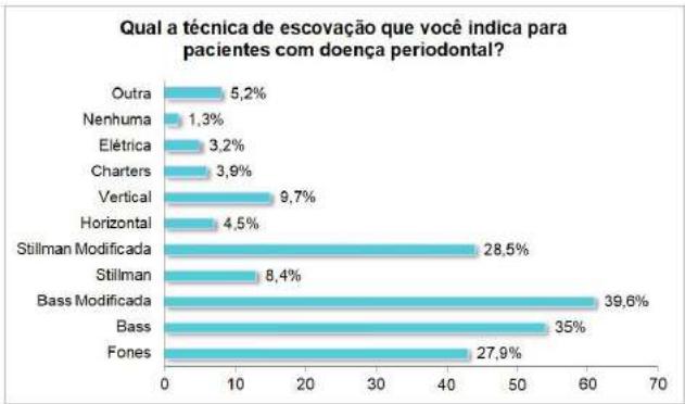 Na recomendação dos CD para as técnicas de escovação em pacientes com doença periodontal, as mais recomendadas foram as técnicas de Bass modificada com $39,6\%$ e a técnica de Bass com $35\%$. Uma pesquisa realizada com professores da disciplina de periodontia de algumas Universidades do Nordeste observou que as técnicas mais adotadas pela disciplina de periodontia eram as técnicas de Bass com $46,2\%$ e técnica de Bass modicada com $38,5\%$ (Brito et al., 1999), corroborando com o presente estudo. A técnica de Bass modificada é uma reformulação da original, além dos movimentos de frente e trás, acrescenta movimento de vibração e varredura nos dentes anteriores de cima para baixo, e nos dentes posteriores de baixo para cima. O sucesso dessas técnicas em pacientes com doença periodontal é muito eficaz, pois a remoção do biofilme na junção dentogengival desestrutura todo o acumulo de microrganismos estabelecendo uma boa saúde periodontal (Newman et al., 2016). Pinto (2008) mostra que as técnicas de escovação específicas podem ajudar individualmente cada paciente de acordo com as suas limitações e necessidades, ou seja será necessário avaliar o paciente de forma exclusiva.