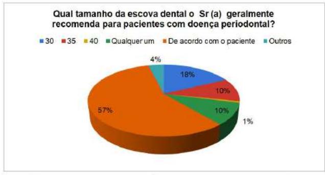 Dos dentistas avaliados $79\%$ afirmaram também conhecer os tamanhos das escovas dentais, enquanto que $21\%$ responderam que não conheciam. Sobre o tamanho recomendado das escovas dentais para pacientes com doença periodontal, o Gráfico 4 demonstra que $57\%$ responderam que recomendavam o tamanho da escova de acordo com o paciente, enquanto que $10\%$ recomendam qualquer escova.
