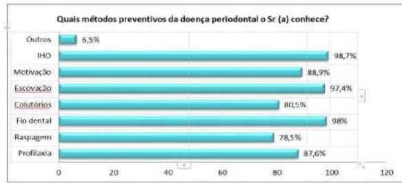 O Gráfico 1 mostra que os meios de prevenção da doença periodontal mais conhecidos pelos cirurgiões-dentistas foram a Instrução de Higiene Oral com $98,7\%$ e o Fio dental com $98,7\%$, enquanto que $78,5\%$ dos CD responderam a raspagem como método de prevenção.