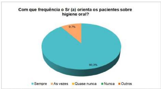 Instruções de higiene oral repetida ao longo de uma série de visitas com reforço das atividades de cuidado domiciliar foram propostas por Rylander e Lindhe, (1997). No presente trabalho quando perguntados sobre a frequência com que orientam os pacientes, $90 {, } 3\%$ afirmam que sempre realizam orientação de higiene oral e $9,7\%$ responderam que fazem isso às vezes, ou seja, a grande maioria tem a preocupação em esclarecer sobre a higiene oral, destacando assim, a importância da relação entre profissional e paciente através da comunicação. Marin e colaboradores (2011) cita que, o bom sucesso do tratamento odontológico depende dessa comunicação, destacando programas de incentivo associado à higiene oral como estratégias fáceis e efetivas para retirada do biofilme e cuidado das doenças bucais, tendo destaque na busca em atingir uma melhor qualidade da saúde bucal. É importante ressaltar que a orientação é dada de forma individual a cada paciente assim como seu plano de tratamento.