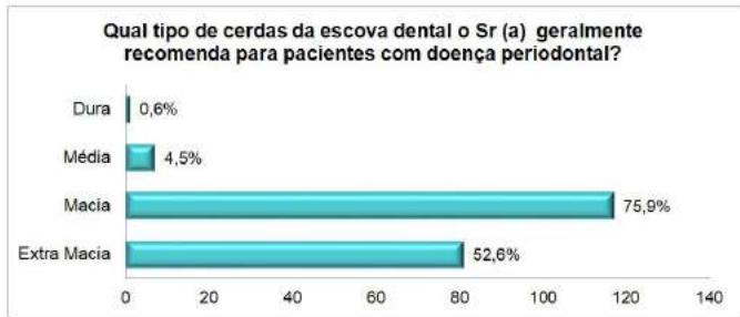 Na análise dos resultados deste estudo, $99\%$ dos CD afirmam ter conhecimento em relação aos tipos de cerdas das escovas dentais. $75,9\%$ dos profissionais afirmaram que recomendam escovas de cerdas macias para os pacientes com doença periodontal e $52,6\%$ indicam as de cerdas extra macia. Newman e colaboradores (2016) afirmaram que quanto mais macia a cerda maior será sua flexibilidade, facilitando a higienização abaixo da margem gengival com a técnica de escovação sulcular, dessa forma atingindo maior parte dos espaços proximais. Estudos demonstram que escovas com diferentes tipos de cerdas apresentam resultados distintos quando avaliados a remoção do biofilme e potencial lesão aos tecidos bucais. As cerdas duras e médias removem melhor o biofilme da superfície dental quando comparadas às do tipo macia, contudo, causam maiores danos ao tecido gengival e podem também causar abrasão (Carvalho, 2007; Zanatta, 2011). Foi demonstrado também que a variação no arranjo dos tufos das cerdas tem influencia na eficiência da escovação, indicando que escovas com cerdas em ângulo cruzado parecem funcionar melhor do que ascerdas planas ou multinível (Slot et al., 2012).