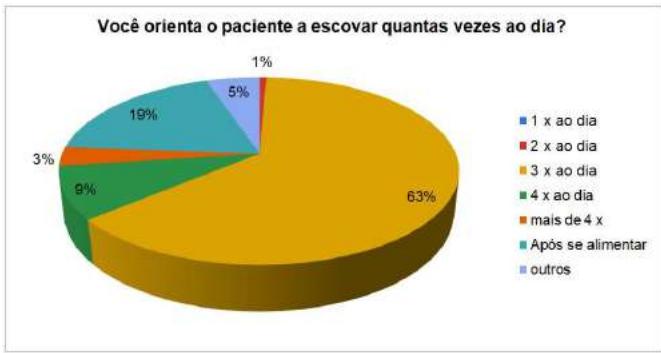 Em relação a frequência que o CD orienta o paciente a escovar os dentes por dia, foi observado que $63\%$ dos profissionais indicam a escovação 3 vezes ao dia. Um estudo demonstrou que a saúde gengival é mantida quando os intervalos de remoção do biofilme dental são mais frequentes que a cada 48 horas (Löe, 1971). De acordo com a Associação Dental Americana (ADA) a escovação deve ser realizada pelo menos duas vezes ao dia, pois a grande maioria dos indivíduos não consegue eliminar todo biofilme em uma única escovação, e a repetição melhora oresultado final.