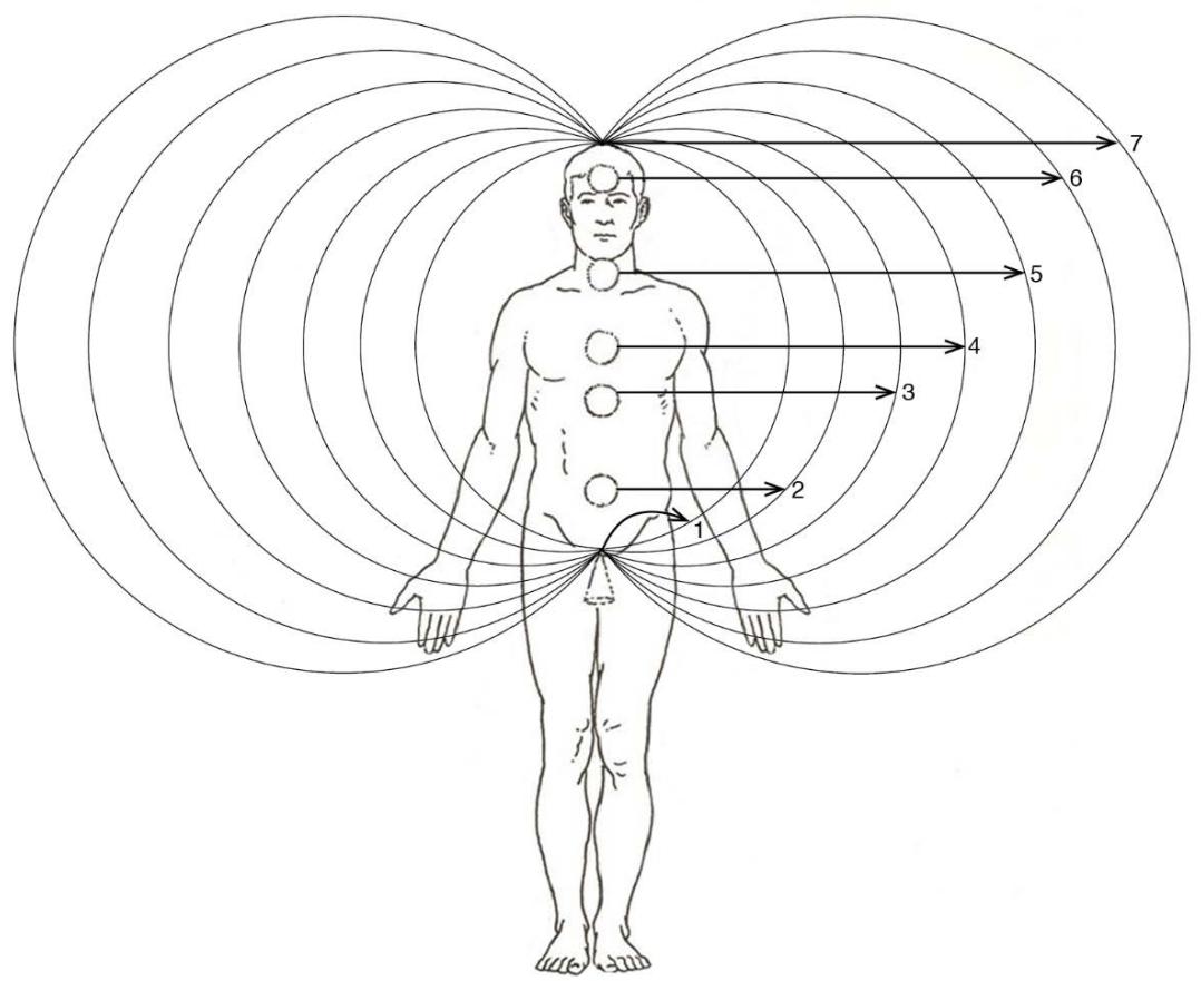 These alternating vortices and anti-vortices are numbered with consequent numbers starting with the tailbone and finishing with the top of the head. They are called in ancient Hindu texts "chakras", which mean "spinning wheals" in Sanskrit. To the seven chakras correspond seven discrete (quantum) energy levels of the aura's NEMF (Fig. 1) [2]. Look at the quantum energy levels of our aura (Spirit) NEMF and tell me how the spinning NEMF of the observer with quantum energy levels not to be expected to influence quantum measurements. Of course, it would.