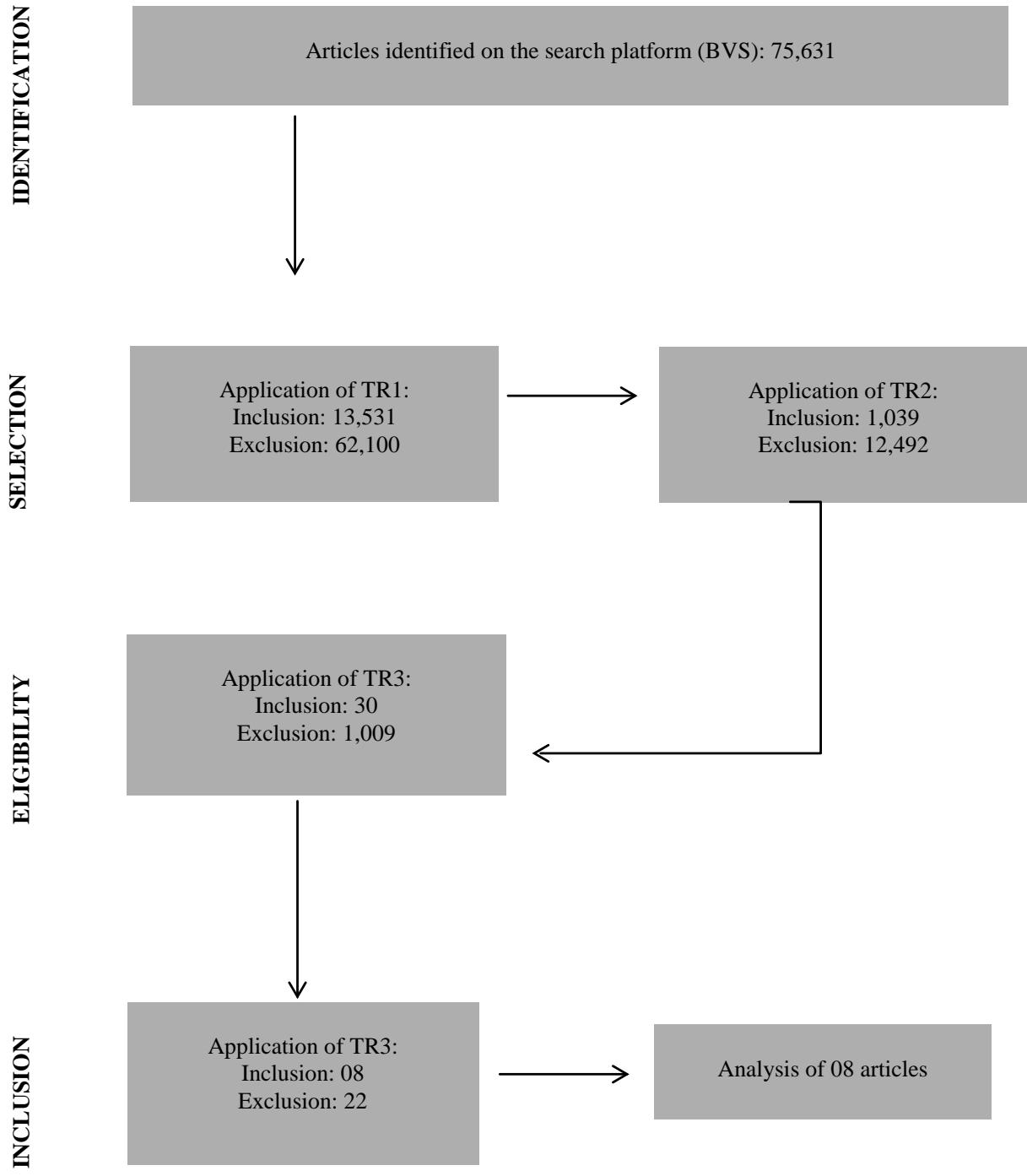The instrument for selecting the studies was the Relevance Test (TR), based on Pereira's model (2006)[^11]. This consists of forms containing four selection steps, to include or exclude the articles found with the search strategy.