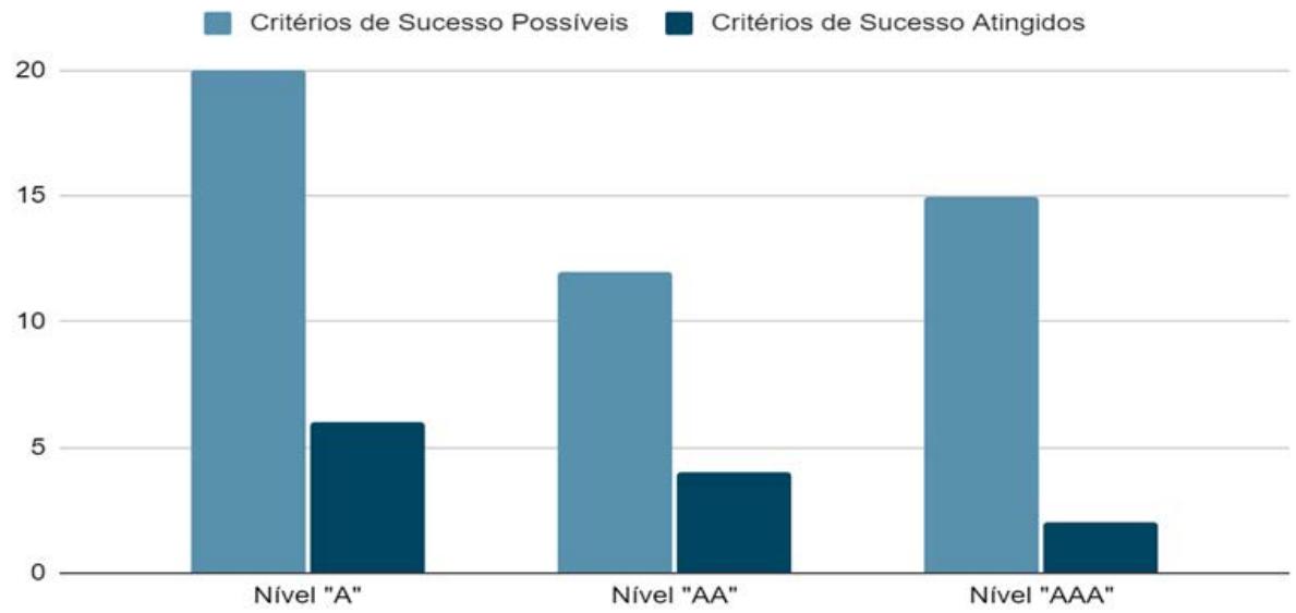 To better understand these criteria, it needs to be specified that there are 78 criteria divided by their criticality. The 30 "A" level criteria are considered the most critical and for this reason are the ones that have the most implementation needs. The second level of criticality would be the 20 "AA" requirements and these are considered the requirements of intermediate urgency, which are important for accessible navigation, but should only be considered after obeying the 30 requirements of the first level of criticality. Finally, the third level of criticality "AAA", composed of 28 accessibility requirements, is the level with the lowest criticality and should only be met when the other 50 items of levels one and two are fully met.