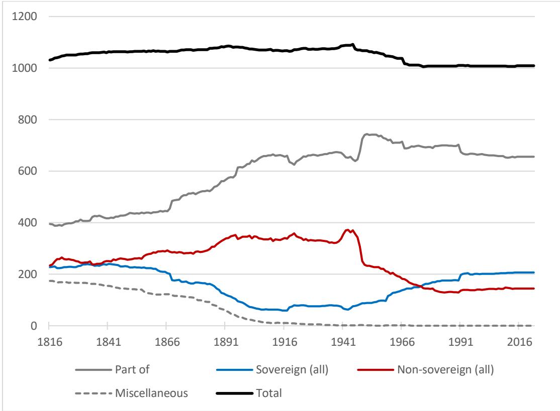 How many countries are there in the world?” is a question that has so far received little attention as a research topic. The objective of this paper is to explore this issue by developing a conceptual and methodological reflection. It analyzes three key questions: the determination of the number of countries, the definition of a country, and the quantification of the countries of the world. Drawing from the perspectives of various social sciences disciplines, it highlights that researchers put forward contradictory conclusions about the evolution of the number of countries. The problem is that they are lacking appropriate data. The paper presents GeoPolHist, a quantitative database dedicated to the identification of the geopolitical entities of the world over the last two centuries. This new research tool is used to reveal significant changes since 1816: a downward trend in the number of the world’s countries and a political restructuring of the world after WWII.