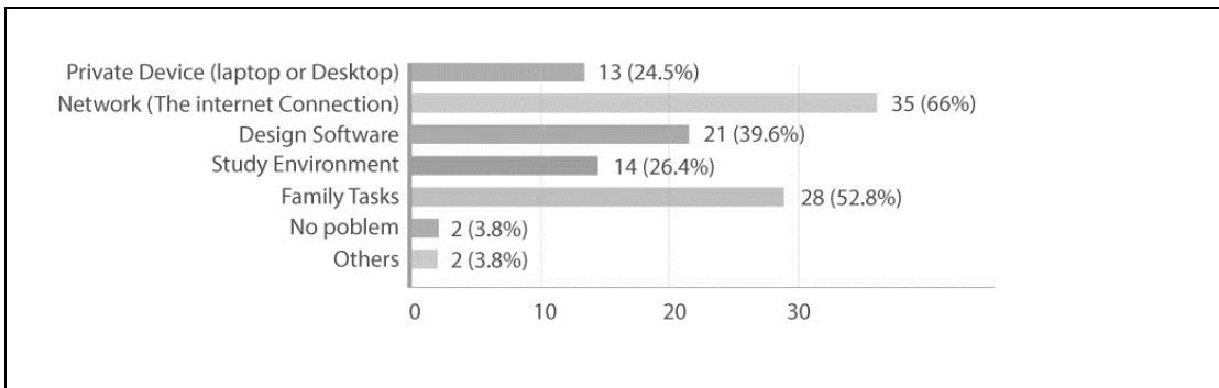 In regard to the most challenges that students face while studying online, the majority of students indicated that internet connection was the most challenging that they encountered at home. The second most common challenge was family tasks that were given to students from their families to do at home. The third challenge was the issue of the availability of design software as many students do not have the software or