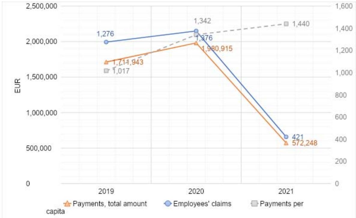 The Fund is financed by contributions from employers – the state entrepreneurial risk fee (which has remained unchanged since 2006 and is equal to EUR0.36 per employee) – gifts and donations, and resources recovered by insolvency administrators in the insolvency procedure (Karaleu, 2021). Fig. 2 below shows how the payments from the Fund have evolved over the last three years.