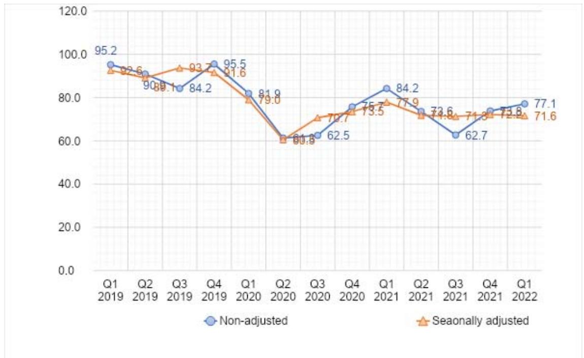 Fig.1: Declarations of bankruptcies of businesses in EU, Q1 2019 to Q1 2022 (2015 = 100)