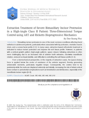 Dr. Dao Quang Huy. 2026. \u201cExtraction Treatment of Severe Bimaxillary Incisor Protrusion in a High-Angle Class II Patient: Three-Dimensional Torque Control using ART and Ricketts Bioprogressive Mechanics\u201d. Global Journal of Medical Research, Global Journal of Medical Research - J: Dentistry & Otolaryngology GJMR-J Volume 26 (GJMR Volume 26 Issue J1).