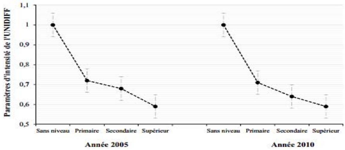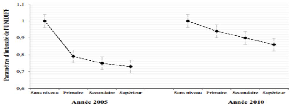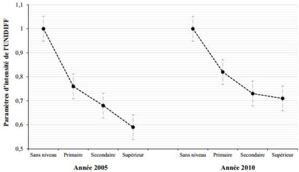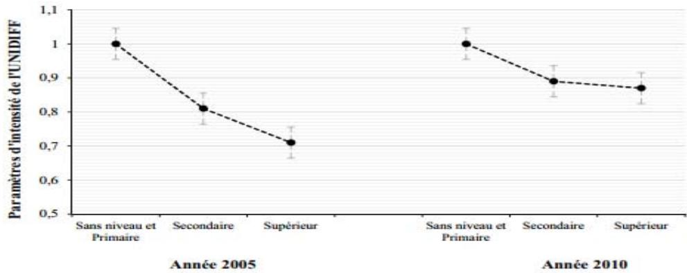 According to the figure above, we observe the fall in the point values of the intensity parameter Unidiff in 2005 compared to 2010 because the slope of 2005 is steeper than that of 2010. Seen from another angle, we will say that between 2005 and 2010 the level of family involvement in children's education is increasing. The immediate consequence is, in addition to the reduction of inequalities of opportunity of access to segments of the Cameroonian labor market, the use of the level of education as an intermediary of intervention of the family for the positioning of their children on the labor market. In 2010, unlike in 2005, the intervention of the family with regard to access to segments of the labor market seems more marked. Jackson Golthorpe and Mills (2005) reach the same result in their work. This leads to a questioning of liberal theory. Indeed, our results indicate that the influence of education in the mediation for the positioning of young people in the labor market tends to decrease. The phenomenon of diploma inflation that follows the expansion of education in Cameroon seems to be a plausible explanation.