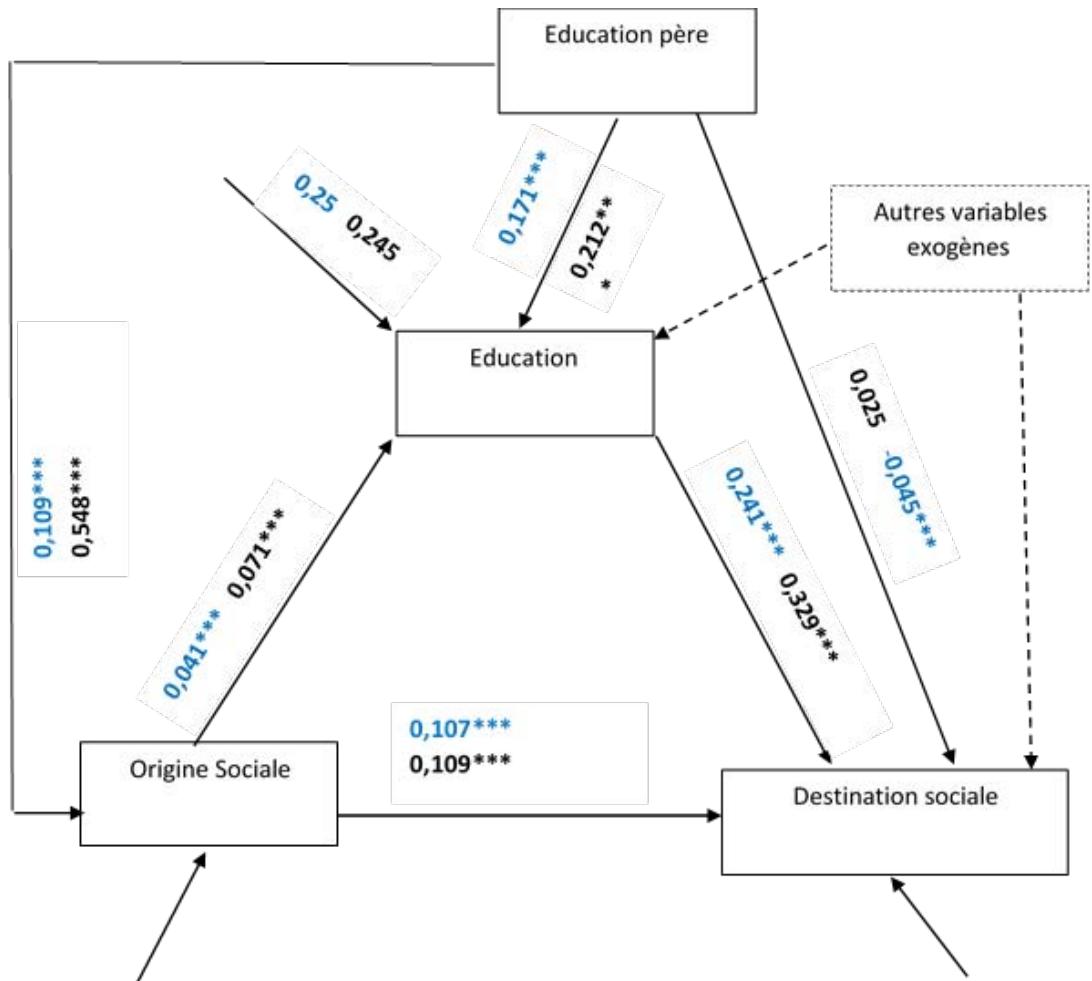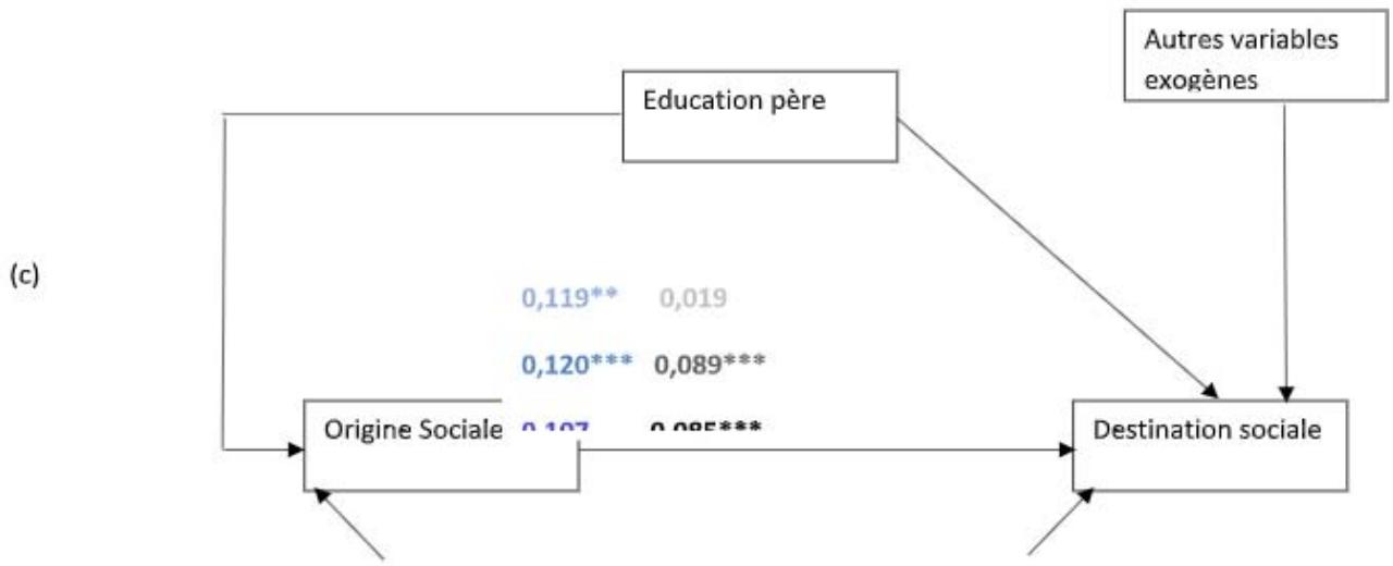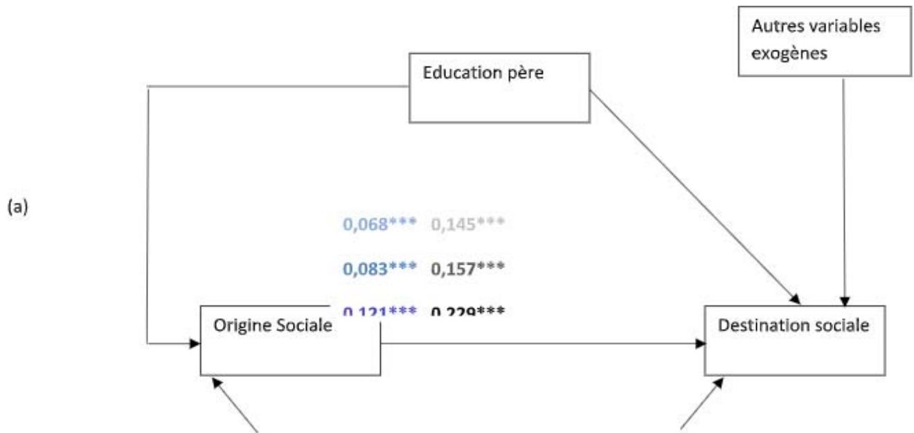 Although log linear models allow us to analyze intergenerational mobility and to determine the place of education in the process of social reproduction, they do not, however, allow us to determine causal relationships. For this, we propose to accompany these models with structural models such as analyzes of causal paths. They also make it possible to test the robustness of the results obtained from the log-linear models.