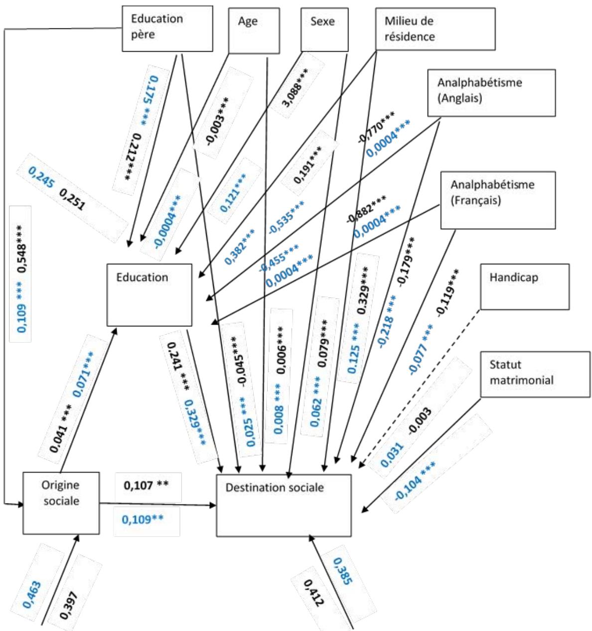 Lecture de la figure: Les effets en noirs sont ceux de 2005, en bleu ceux de 2010. Les effets les plus foncés et les plus en dessous sont ceux du supérieur, ensuite le secondaire et les moins foncés sont ceux du primaire. \*\*\* significativité à 1%. Les flèches en traits interrompus représentent un ensemble de variables exogènes parmi lesquels on retrouve: l'âge, le sexe, le milieu de résidence, le statut matrimonial, le niveau d'éducation du père, le statut d'handicap et d'analyphabète (anglais et français) de l'enfant. Les effets de ces variables exogènes du modele ne sont pasprésentés ici par soucis de simplification.