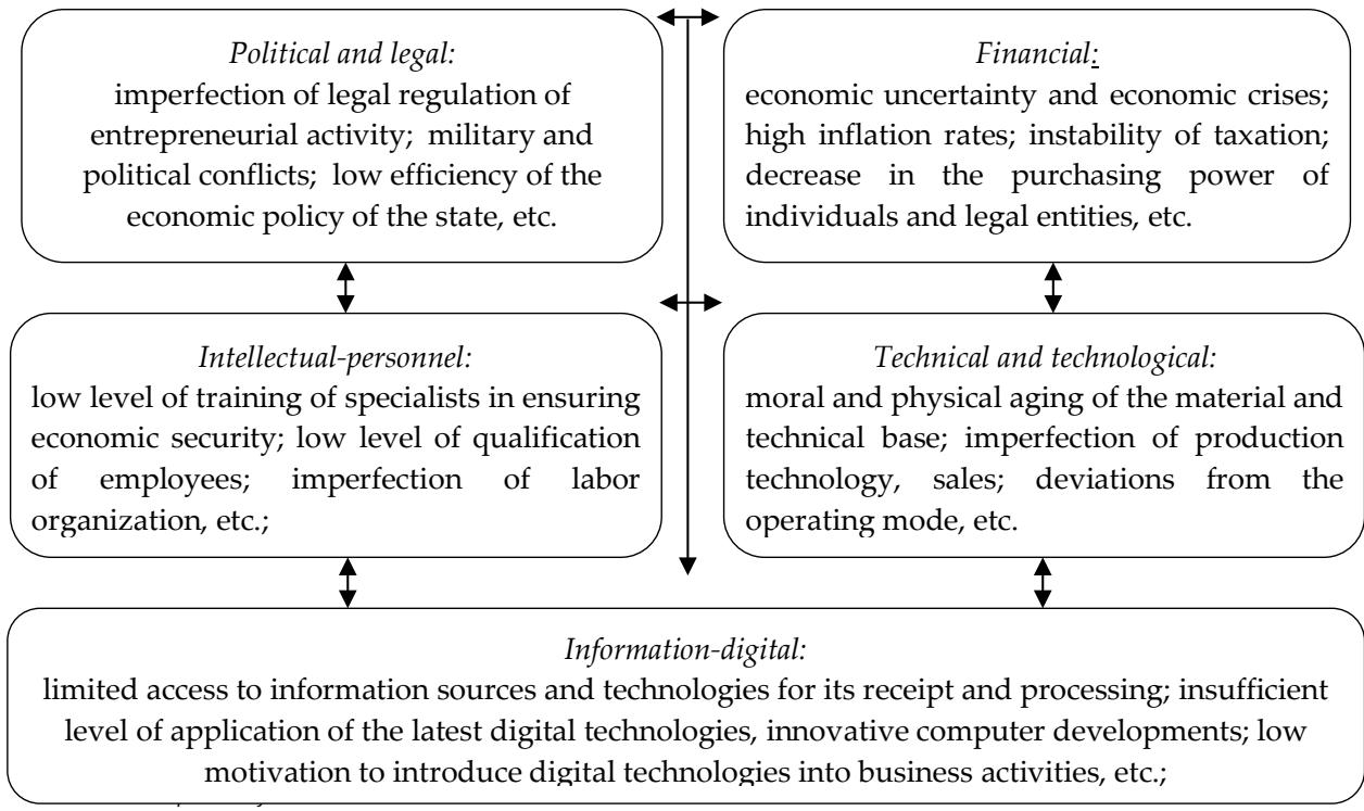 - managerial (improvement of the organizational structure; unfavorable creative environment; urgent need to promptly search for new methods of ensuring economic security; adjustment and adaptation of job responsibilities of individual employees, etc.).