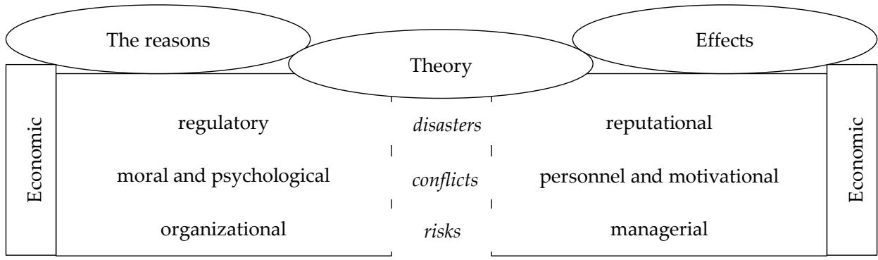 The cause-and-effect relationship of threats to economic security in the context of theories of catastrophes, conflicts and risks is based solely on economic reasons (the desire to obtain economic benefits or other benefits) and consequences (deterioration of the economic, material and technical condition of the enterprise).