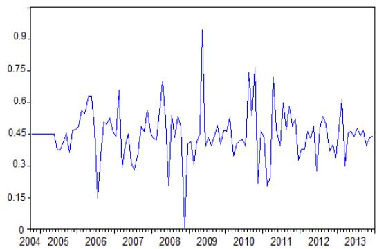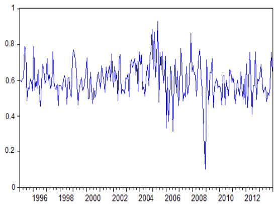 Turkey, Tunisia and Jordan show the lowest level of integration with an average rate of $50\%$ during the study period. However, all of the markets studied experienced a considerable drop during the 2007-2008 period.
