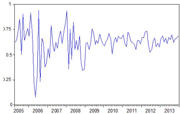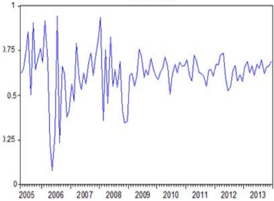 To summarize, the dynamics of conditional correlations show an overestimation of the degree of integration of the markets studied, so our results confirm the questioning of the relevance of the correlation technique as an index of financial integration.