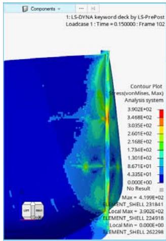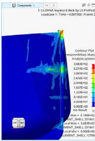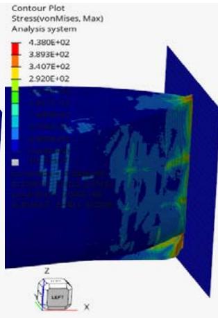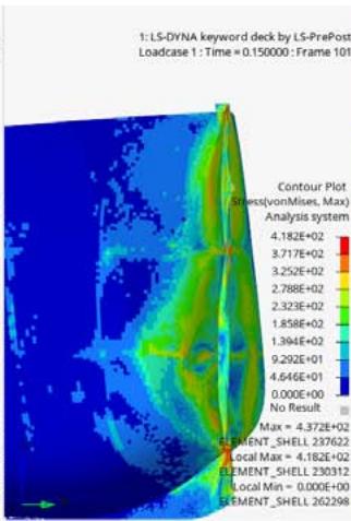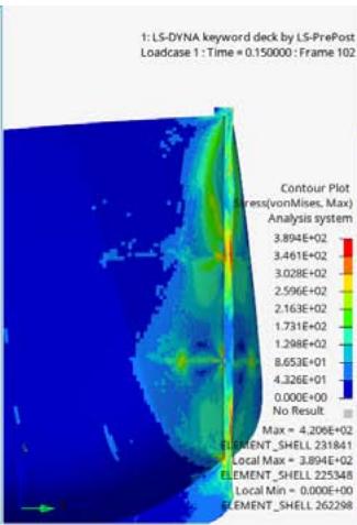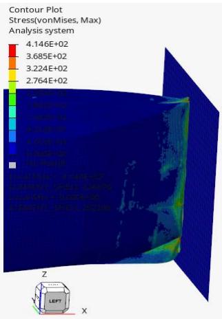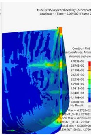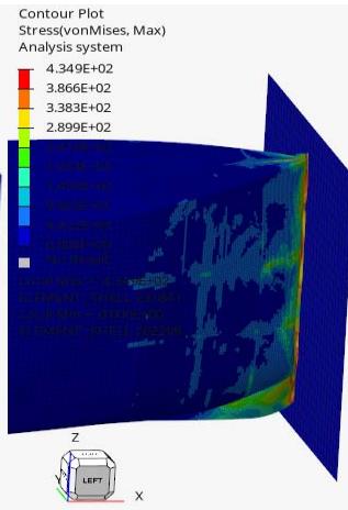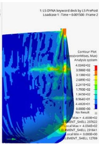 The von Mises stress distribution maps are crucial in understanding the stress responses and locations of plastic deformation. The stresses are shown in Figures 10,11 and 12 at the different times. The Figure 10 shows the wall and for a clearer visualization the wall has been hidden in Figures 11 and 12.