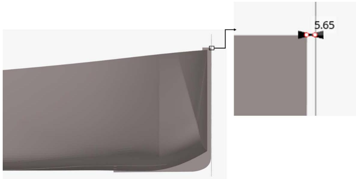 Figure 6: Distance between ship and rigid wall Because the wall is stationary, all edge nodes of the rigid wall are fixed (encastré) to ensure they remain in place during the collision, as showed in Figure 7 and the node containing engine mass is shown in Figure 8. Then, all mesh qualities are checked using the built-in quality index in the Hypermesh software after meshing the whole model.