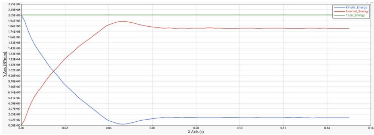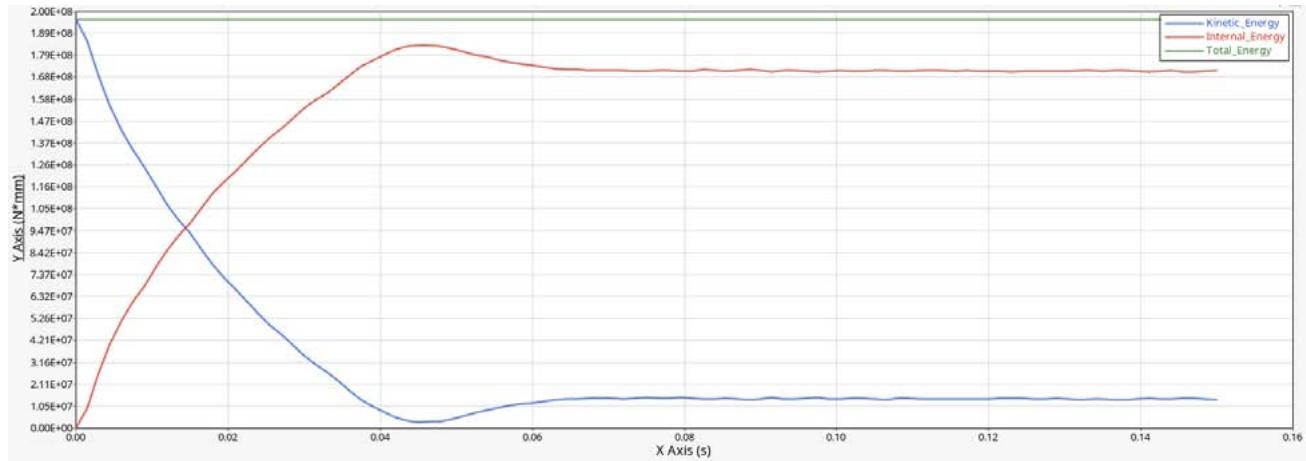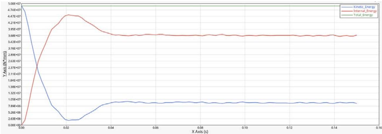 - 5 knots with engine: At the outset of the simulation, the initial kinetic energy is maximum at $5.119 \times 10^{7}N.\mathrm{mm}$. Upon collision, the kinetic energy rapidly converts into internal energy in form of deformation and levels at around $9.36 \times 10^{6}N.\mathrm{mm}$. The maximum internal energy value is approximately $4.761 \times 10^{7}N.\mathrm{mm}$. The total energy remains constant at $5.119 \times 10^{7}N.\mathrm{mm}$ validating energy conservation.