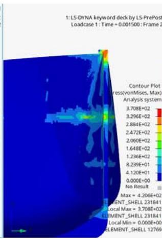 - 5 Knots with Engine, Figures 10 (b), 11(b) and 12(b): The initial impact causes a stress value of $370.8\mathrm{MPa}$ at the same locations. Peak value of generated stress is $420.6\mathrm{MPa}$. This is a $0.76\%$ increase in initial impact stress and a $0.17\%$ increase in maximum stress to the added engine mass.