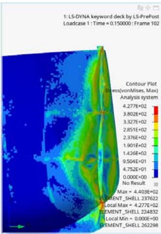 - 10 Knots without Engine, Figures 10 (c), 11(c) and 12(c): The initial impact causes a stress value of $402.3\mathrm{MPa}$ at the same locations. Highest stress value is $437.2\mathrm{MPa}$. Which is a significant increase from the previous two. And the deformation is much more noticeable.