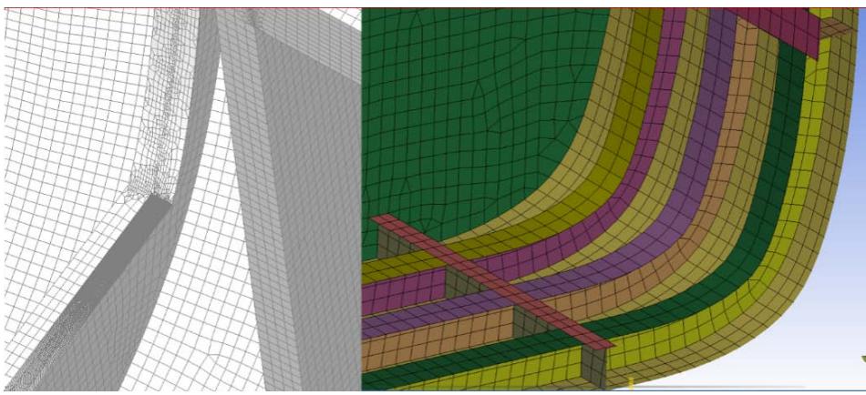 Femap and Hypermesh software are chosen to generate mesh to proceed with the FEA. In complex structures such as ships, it is difficult to maintain mesh coupling and connections, making it harder to maintain a good mesh quality. Both of these programs are used to decide which software is better suited for this specific task. The mesh generated by us by Femap is of poorer quality than that generated by Hypermesh, which is compared in Figure 4.