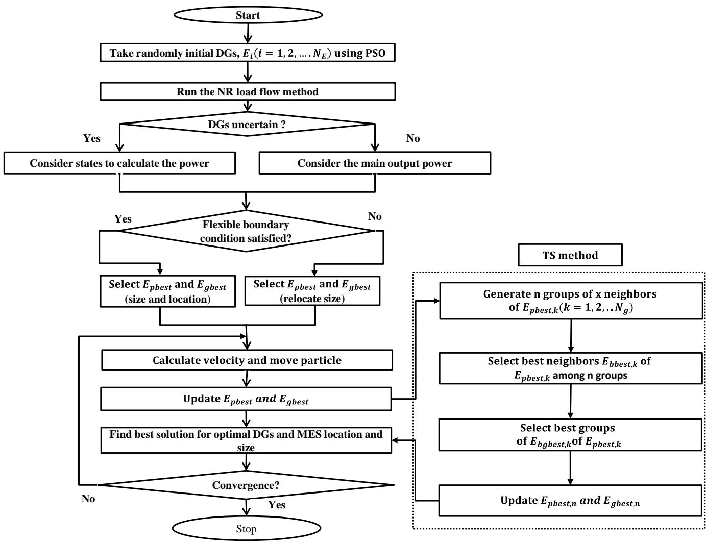 In this hybrid PSO-TS method, PSO is responsible for finding the initial solution and sent to the TS. Depending on the multi-MG flexible boundary condition, PSO will decide whether size and location will be fixed or need relocation of distributed energy resources before dispatch to the TS. TS will search for optimal results using memory structures. If TS can offer the better results from its experience than PSO, that will be considered for the next steps and forward to the PSO. This collaboration process between PSO and TS will continue until this hybrid method ensures the particles' own best and global best among all the particles in the searching spaces. The detailed steps regarding the hybrid PSO-TS algorithm and its application for optimal distributed energy storage location and operation in multi-MGs power distribution are illustrated in Fig. 1. It should be noted that the Newton Raphson's (NR) load flow method is chosen for power flow calculations in the multi-MGs system.
